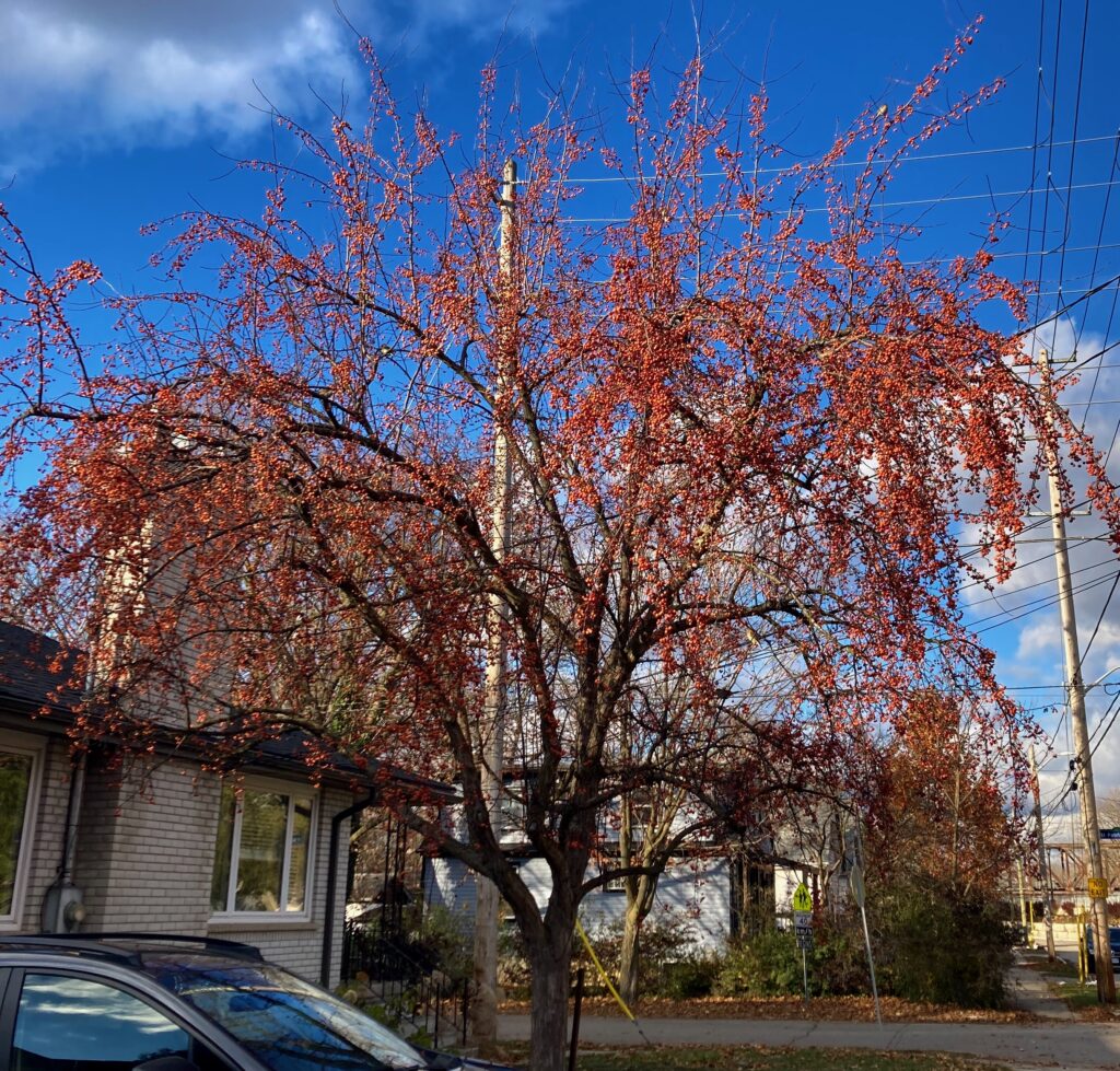 As we walked through the Blackfriars neighbourhood, we came across a crab apple tree laden with fruit. At first, we saw a few American Robins feasting in the tree and on the ground below the tree. As he took photos with his telephoto lens, Glenn noticed two Cedar Waxwings in the branches. Soon the waxwings were joined by several others.