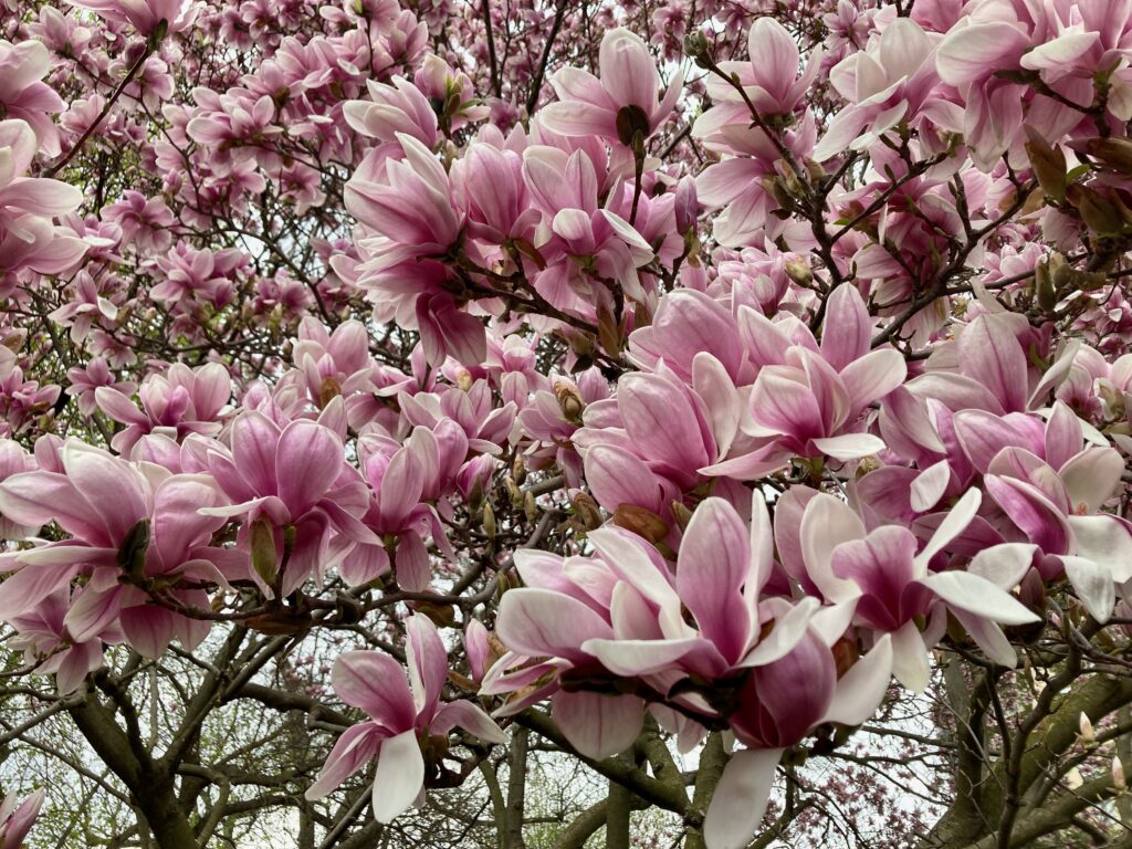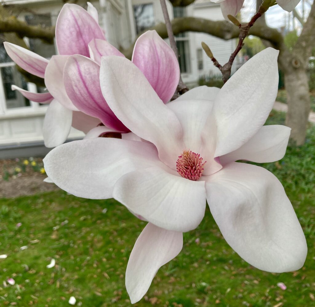 In the afternoon, as the clouds were gathering, we went to see the magnolia trees blooming at Eldon House. The heat had brought the trees into bloom, but we were worried the coming rain would make short work of them. The good news is that the rain and cooler weather did not damage the blossoms. There are magnificent magnolias blooming throughout the city.