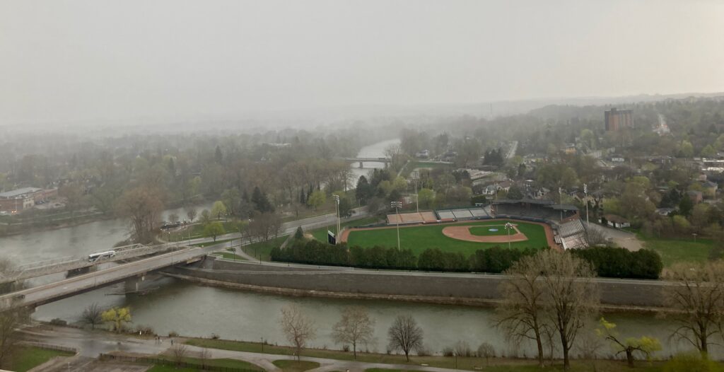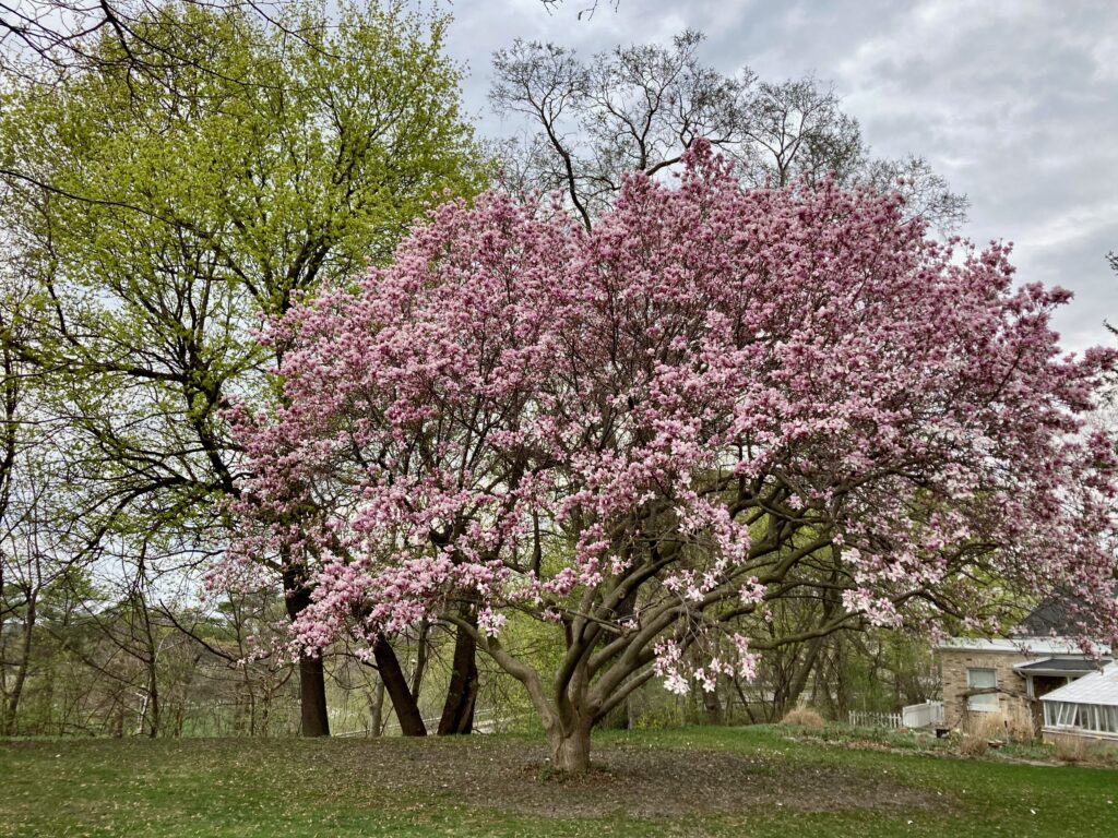 Here is our view on April 16th showing spring green, one of the magnolias, and the sky as the rain set in.