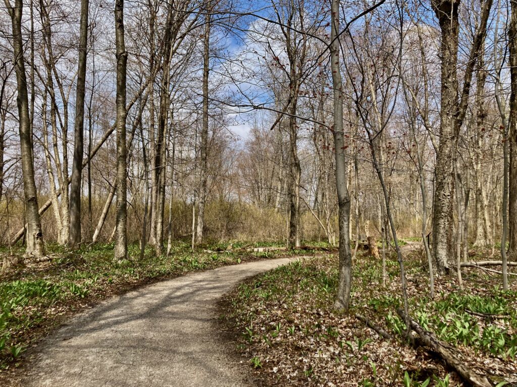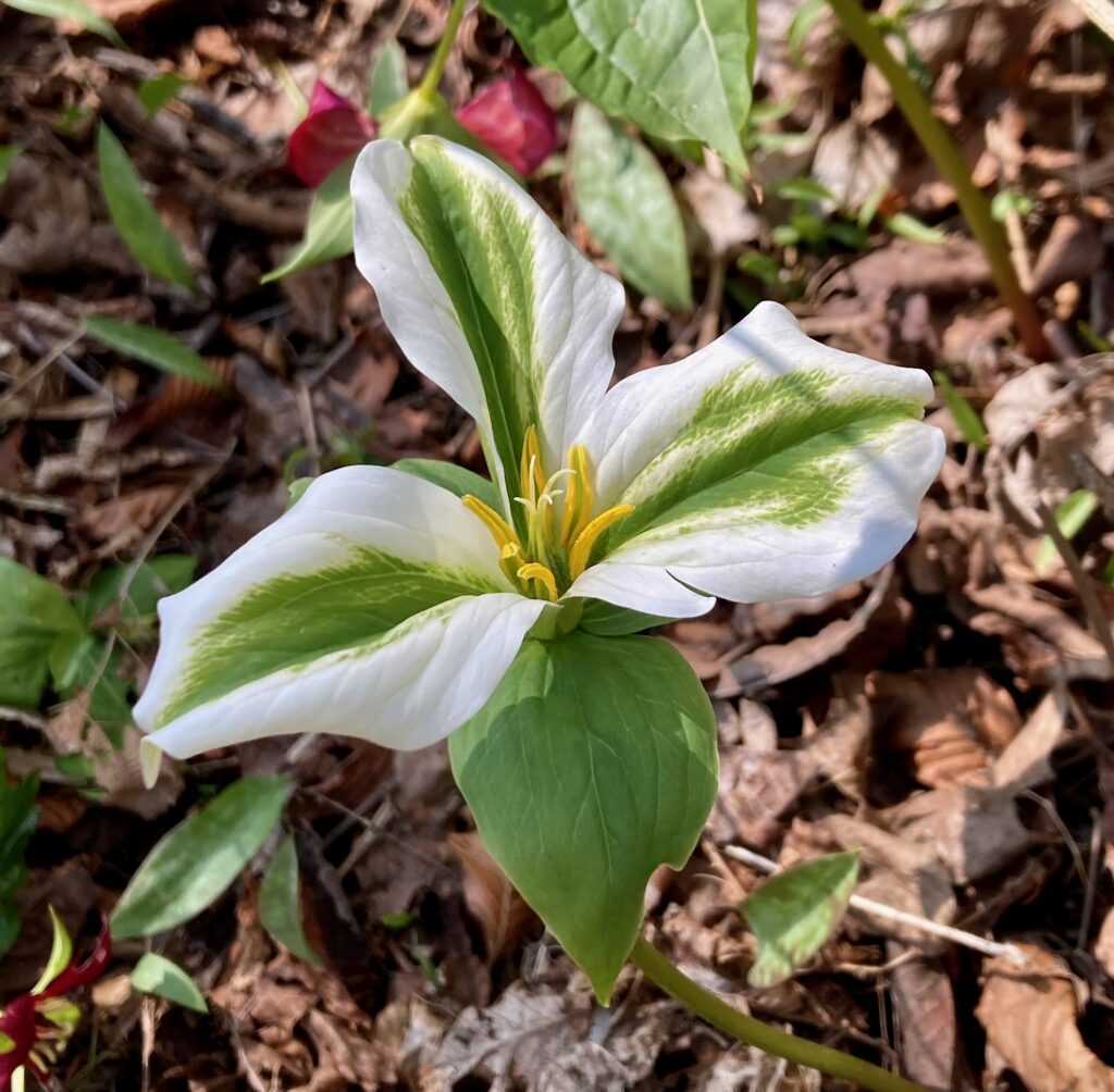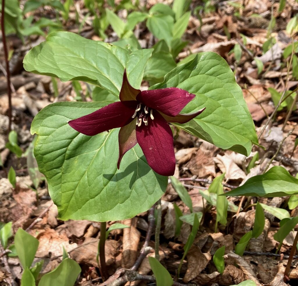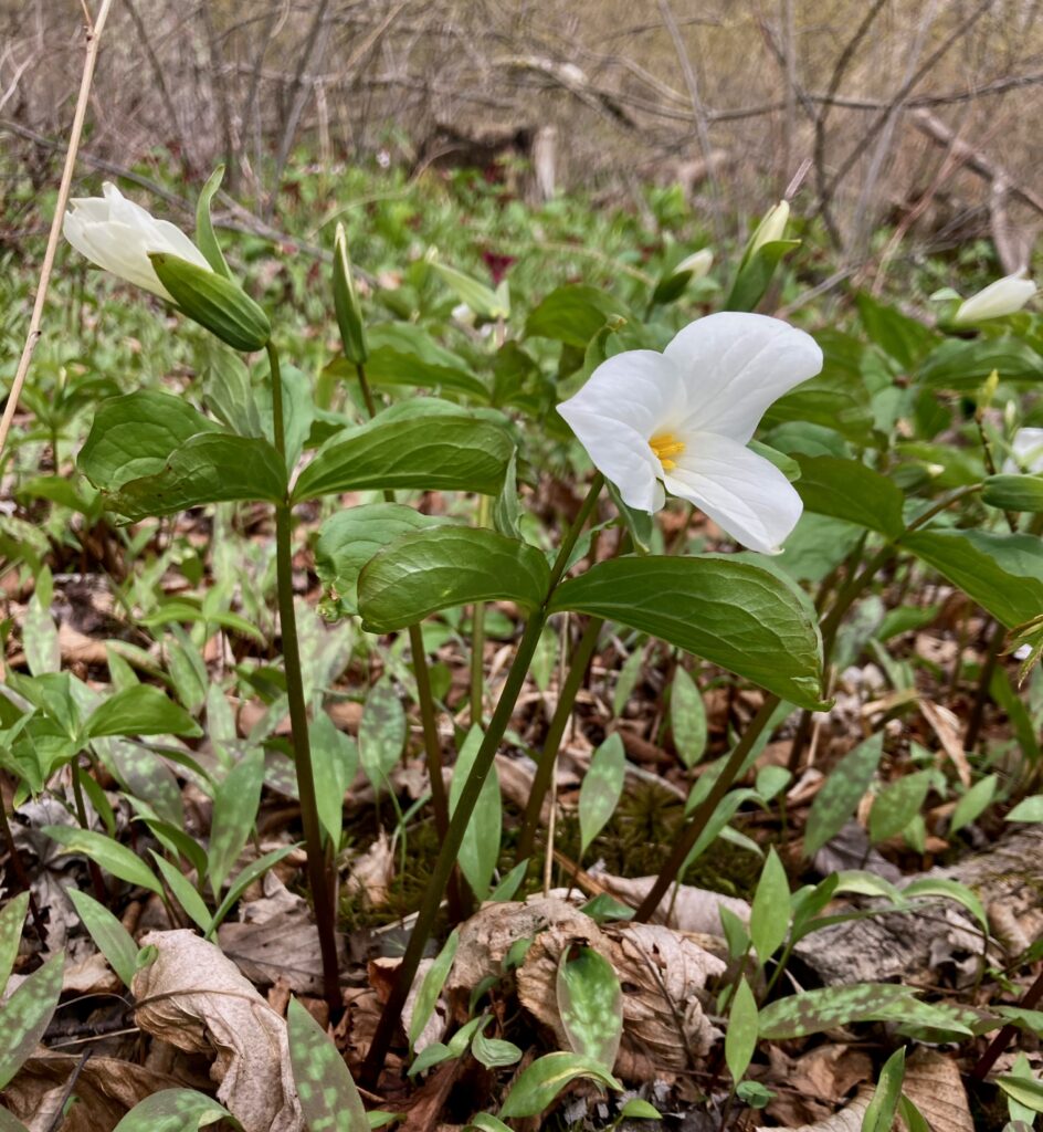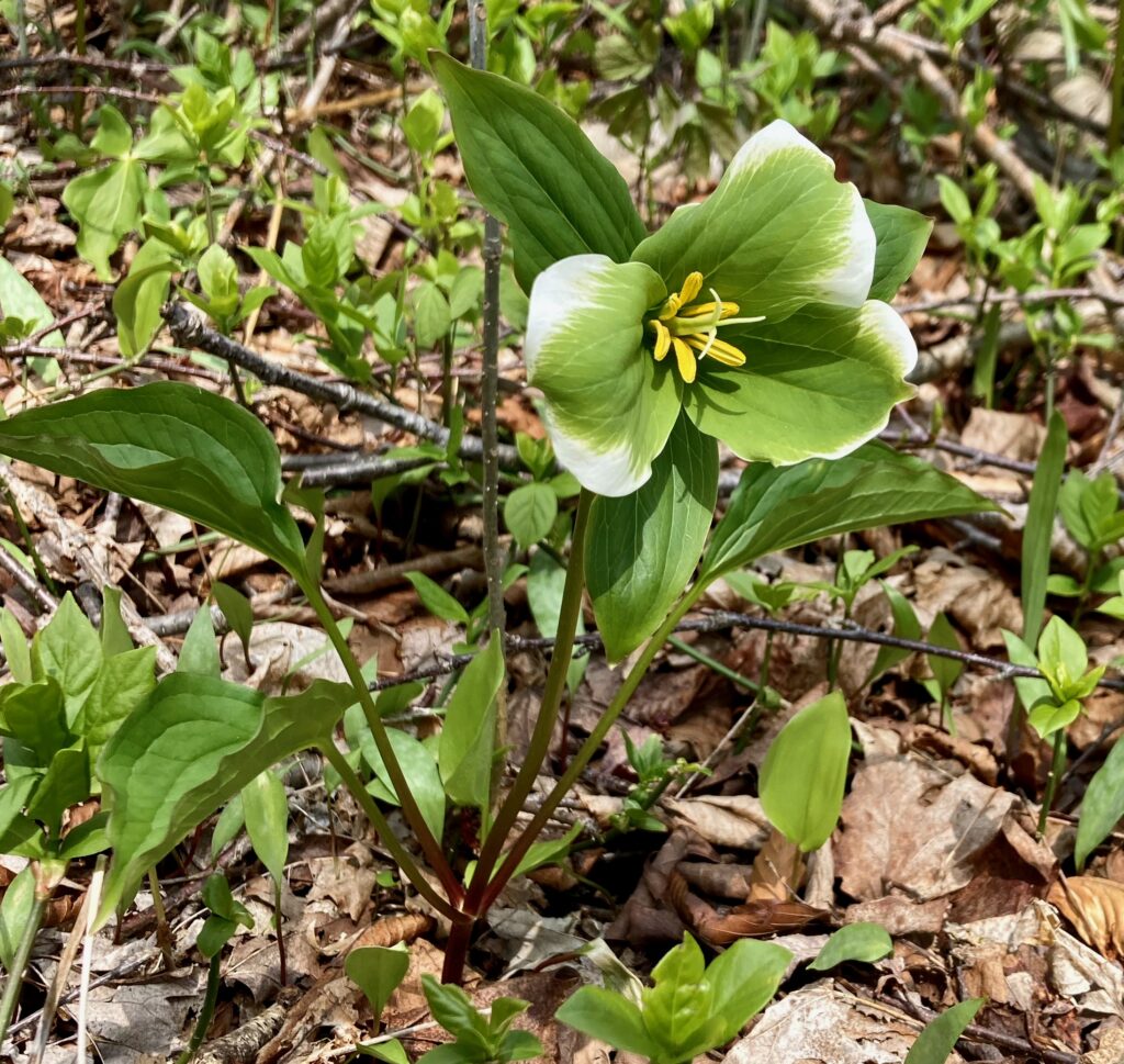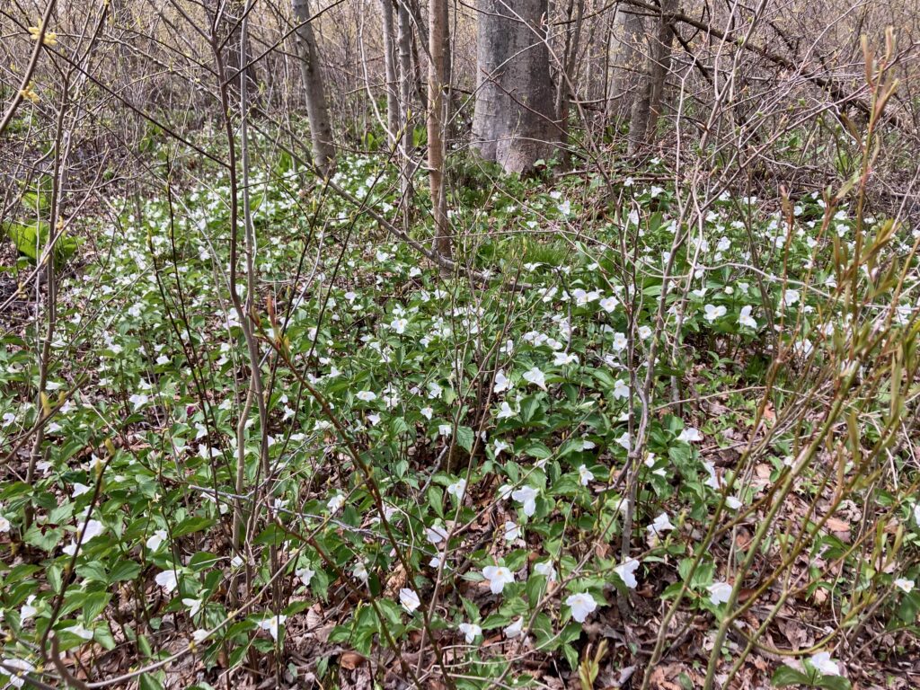There were dense patches of both White and Red Trilliums. We’ve learned that there are two types of trilliums (with many variations within each type): White Trilliums (Trillium Grandiflorum) and Red Trilliums (Trillium Erectus). White Trilliums have wavey edges to their petals whereas the petals of Red Trilliums have straight edges. White Trilliums are susceptible to a greening disorder caused by bacterial organisms (called phytoplasmas). The bacteria cause green markings on the white petals, extra petals and other abnormalities. Nontheless, these flowers are beautiful.