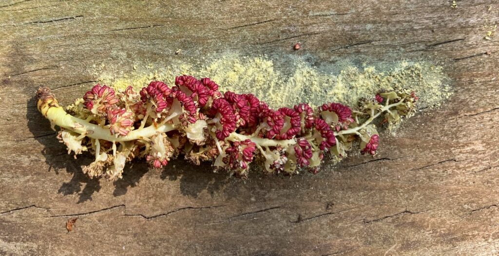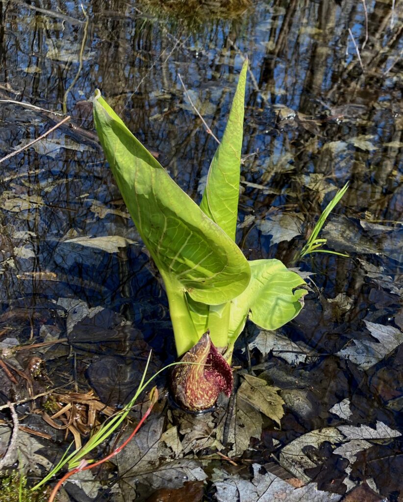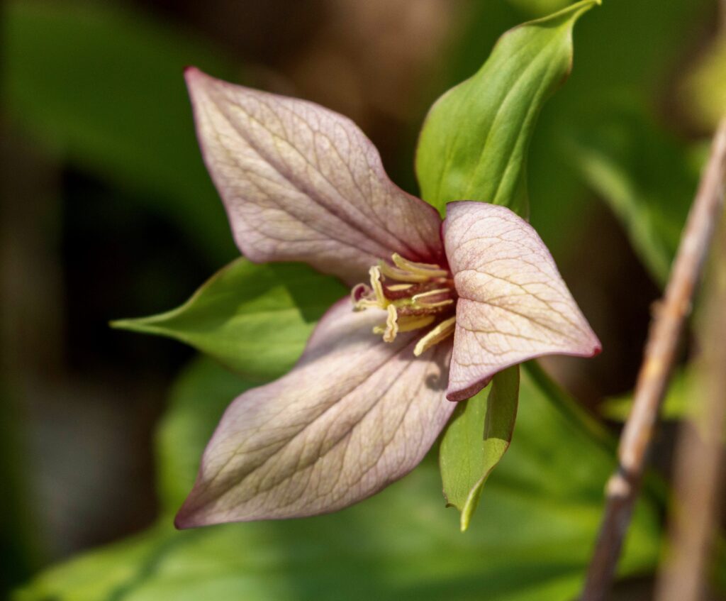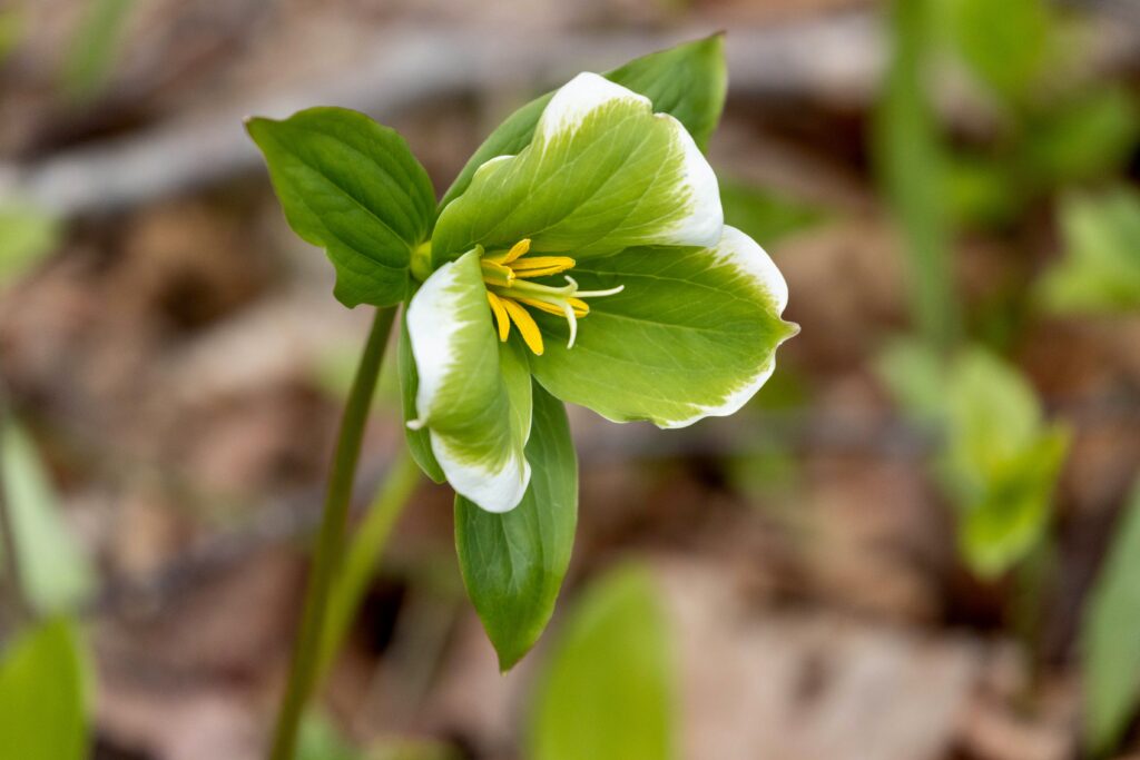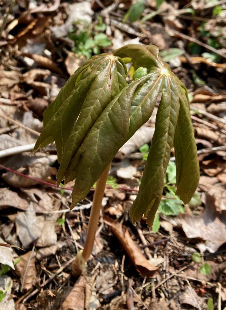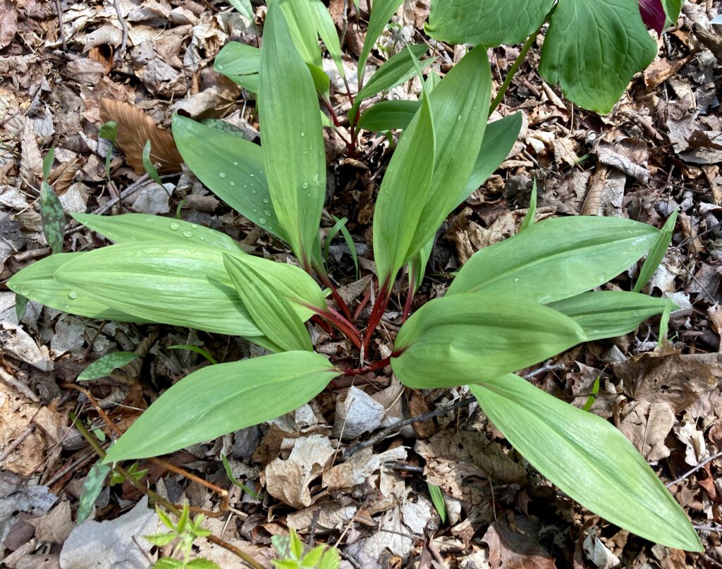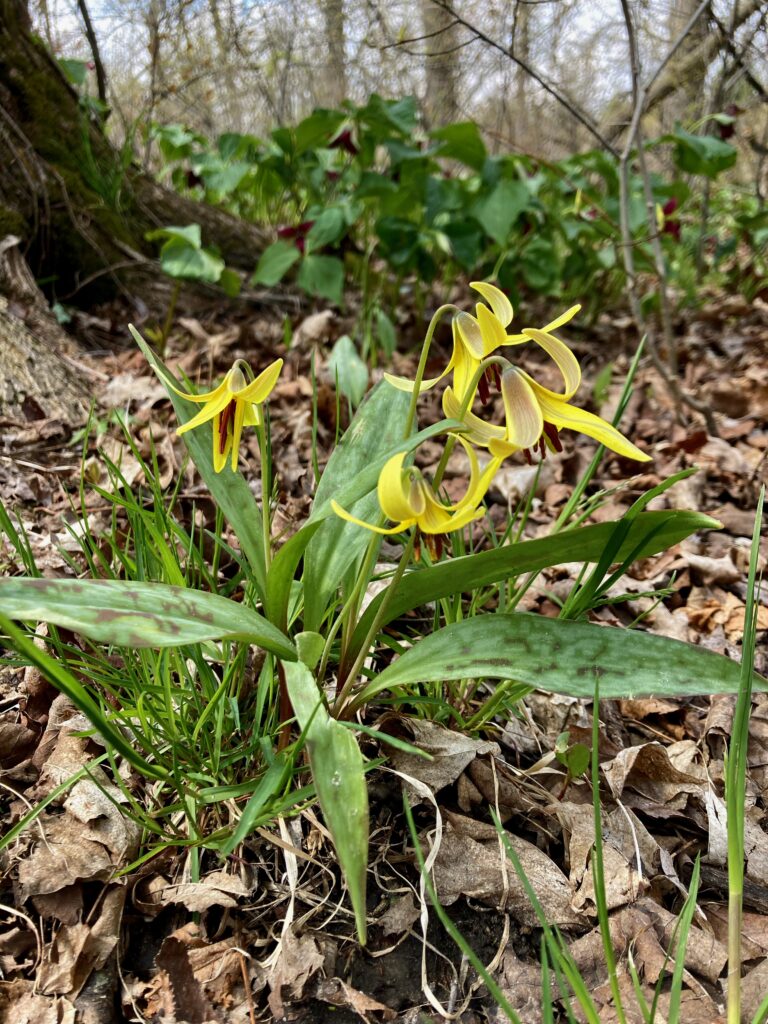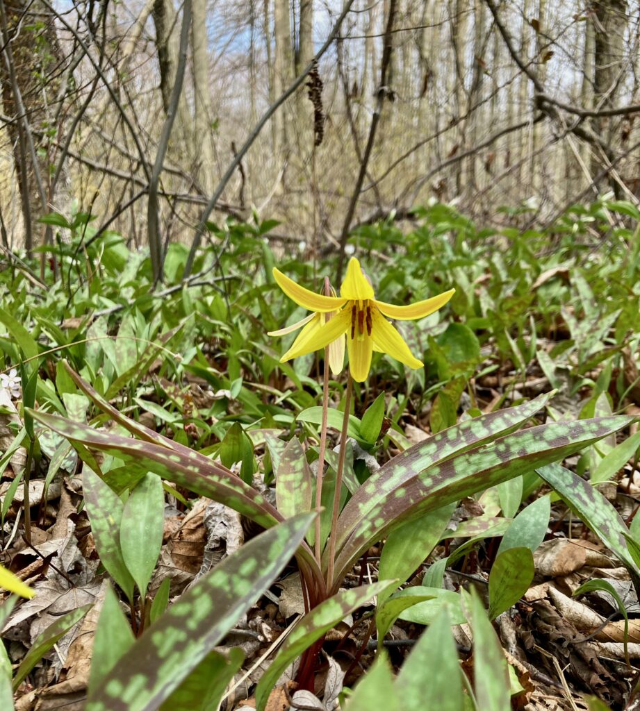 There were dense patches of both White and Red Trilliums. We’ve learned that there are two types of trilliums (with many variations within each type): White Trilliums (Trillium Grandiflorum) and Red Trilliums (Trillium Erectus). White Trilliums have wavey edges to their petals whereas the petals of Red Trilliums have straight edges. White Trilliums are susceptible to a greening disorder caused by bacterial organisms (called phytoplasmas). The bacteria cause green markings on the white petals, extra petals and other abnormalities. Nontheless, these flowers are beautiful.