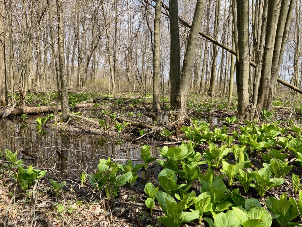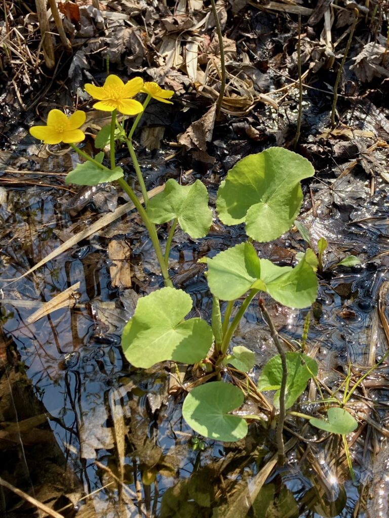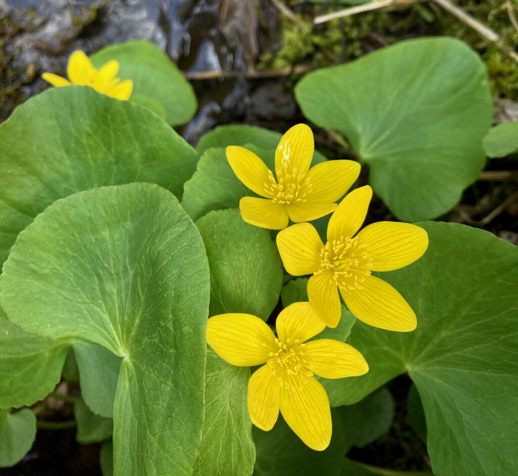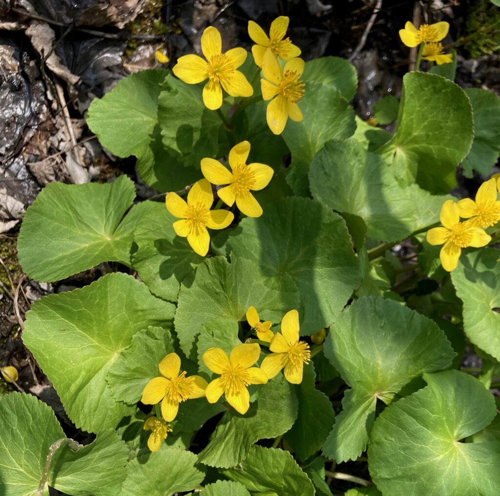 There were also masses of Eastern Skunk Cabbage and Marsh Marigolds in the wet woods. Most of the skunk cabbages had already bloomed and were in leaf, but the Marsh Marigolds were dazzling.