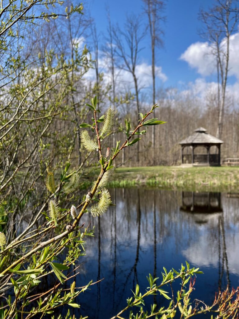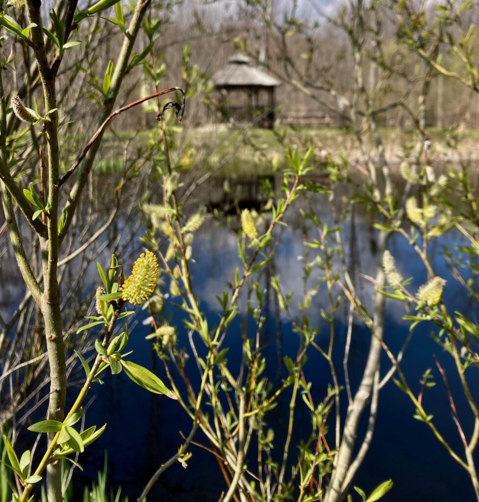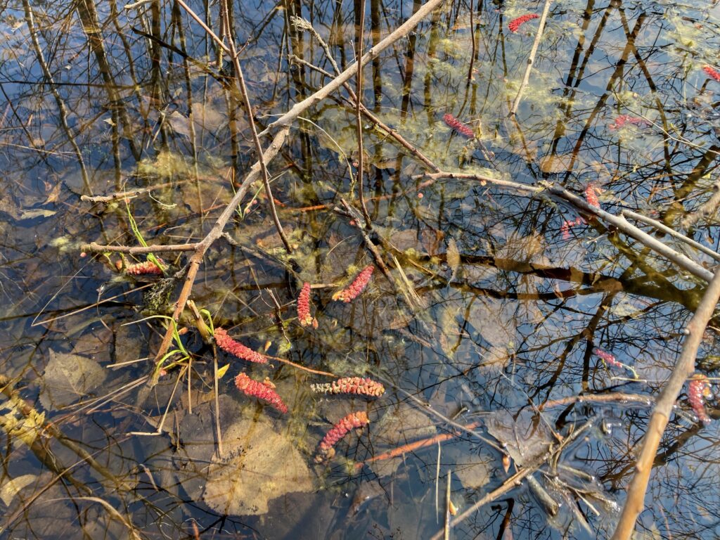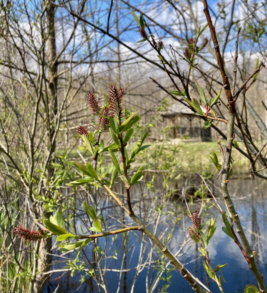The large pond was surrounded with willows that were in bloom. Willows have catkins that are specialized flowers.