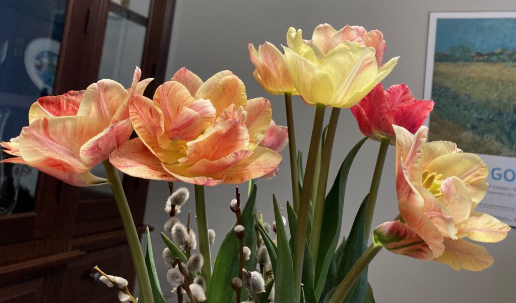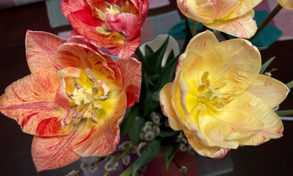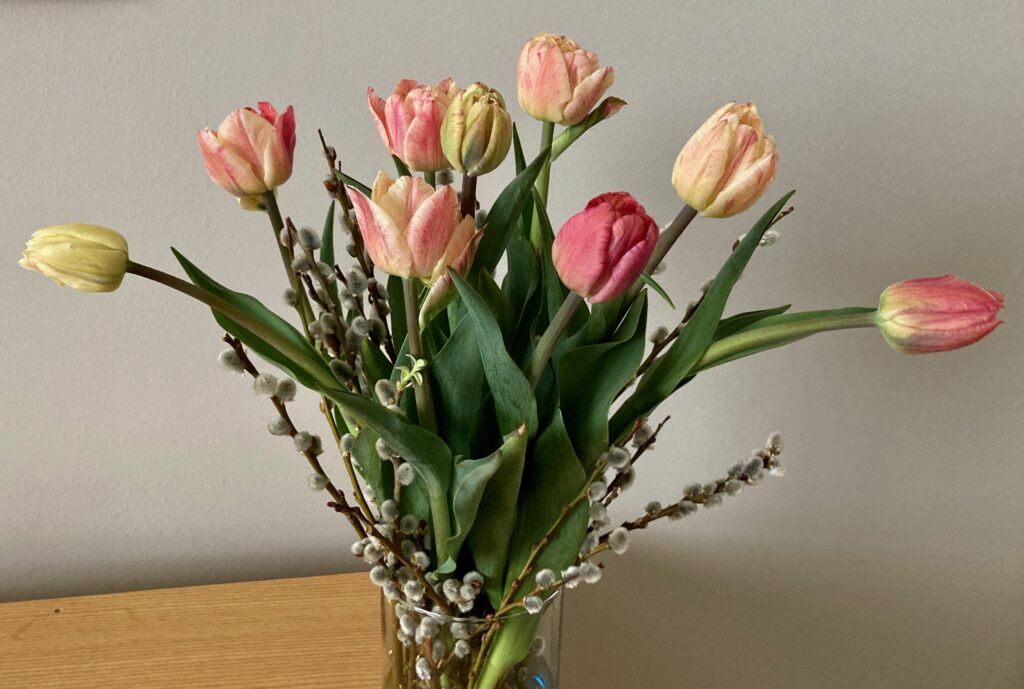 Tulips from Wandering Bee flower farm, each week a new variety; this week’s are double tulips in delicate colours.