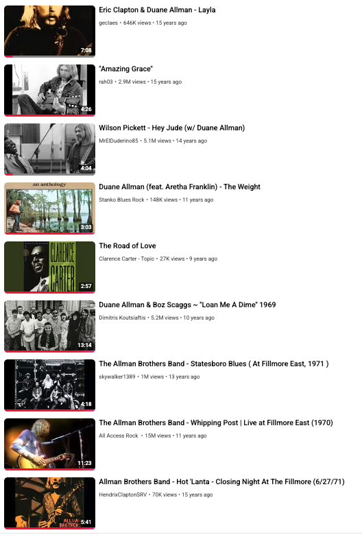 I first heard about Duane Allman as the second lead guitarist on Derek and the Dominos, but I did not realize until years later that he died soon after recording with Eric Clapton. The expressive coda on Layla features Duane playing a different newer guitar from most of the album.