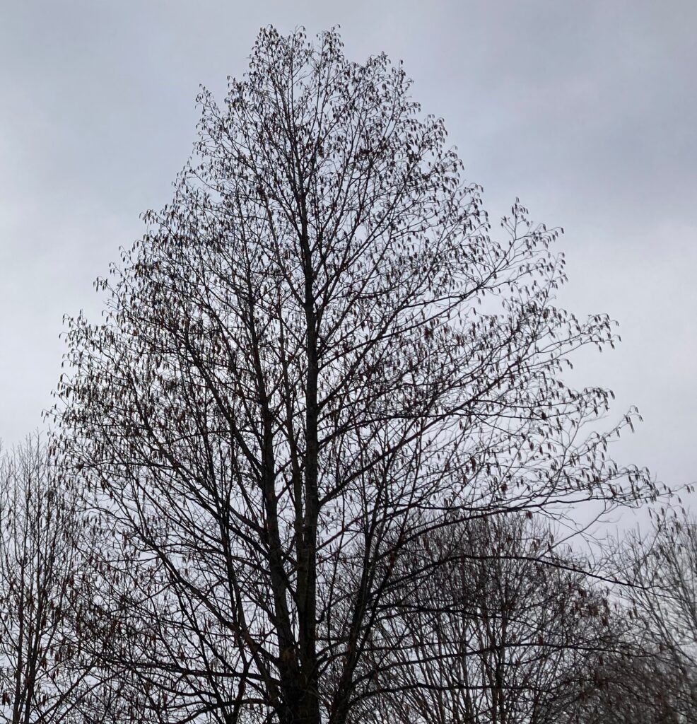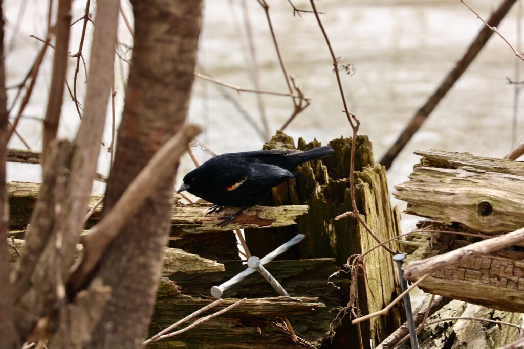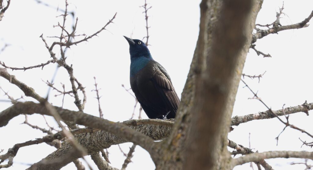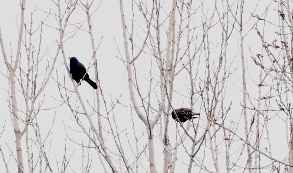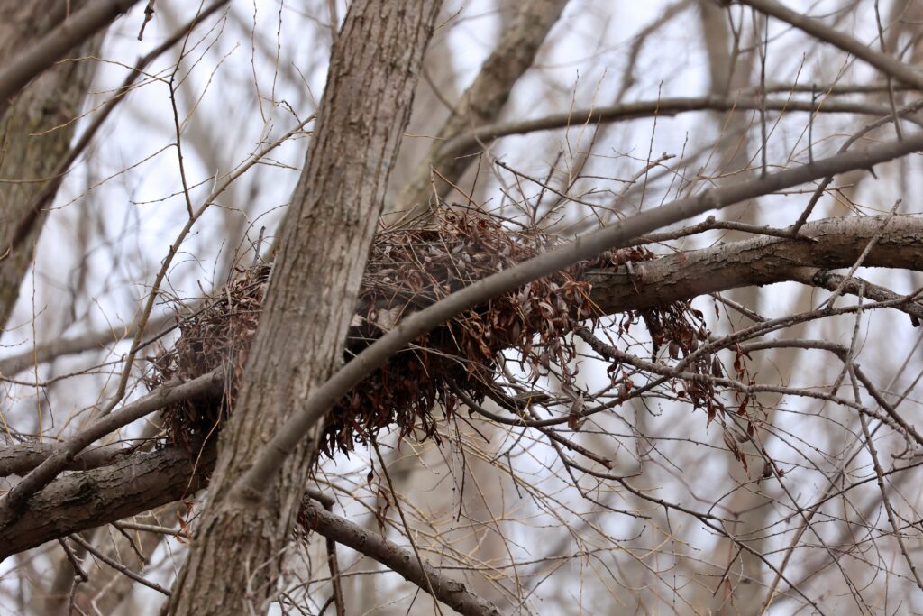A small flock of European Starlings and a few Common Grackles settled at the tops of trees. We’re not sure which birds constructed this nest from last year.