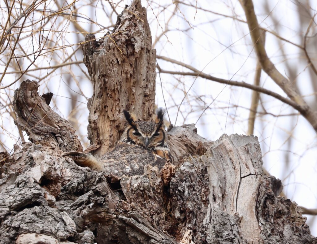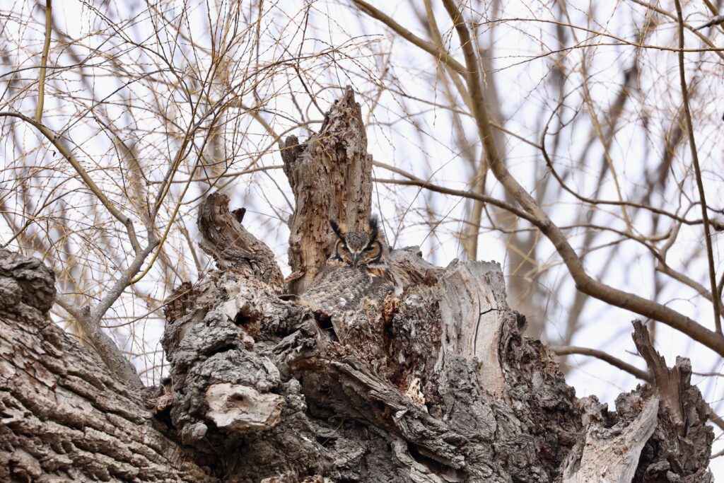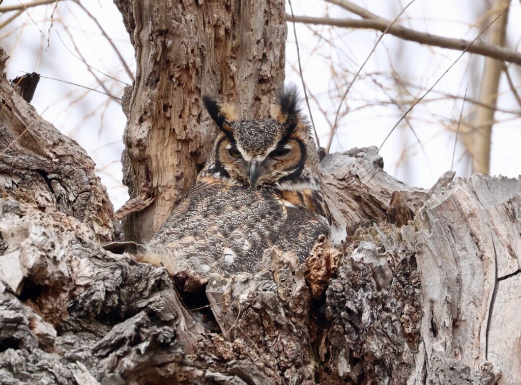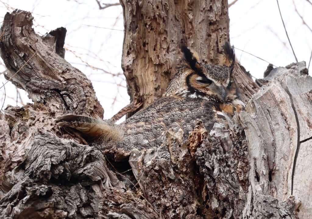 There was a group of photographers staked out below the nesting Great Horned Owls. We joined them briefly. We continue to marvel at the perfect camouflage of the female owl’s feathers.