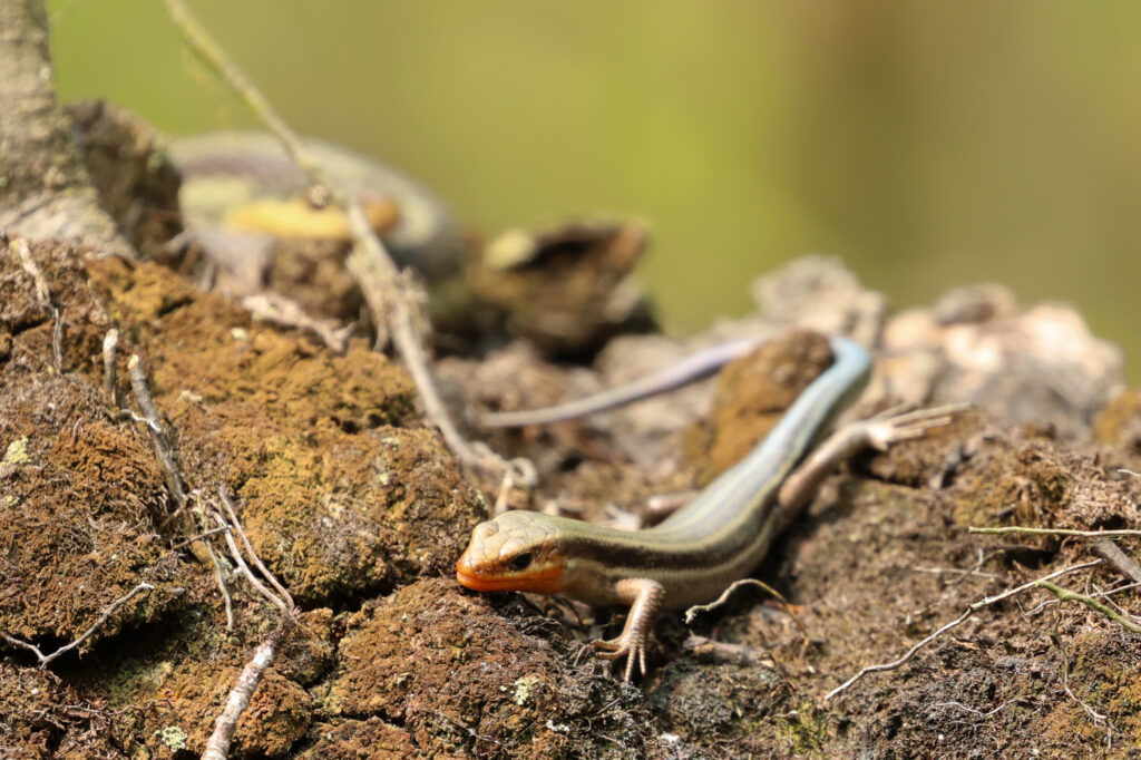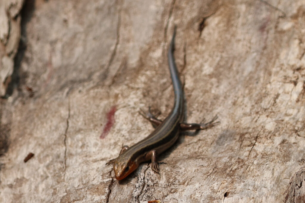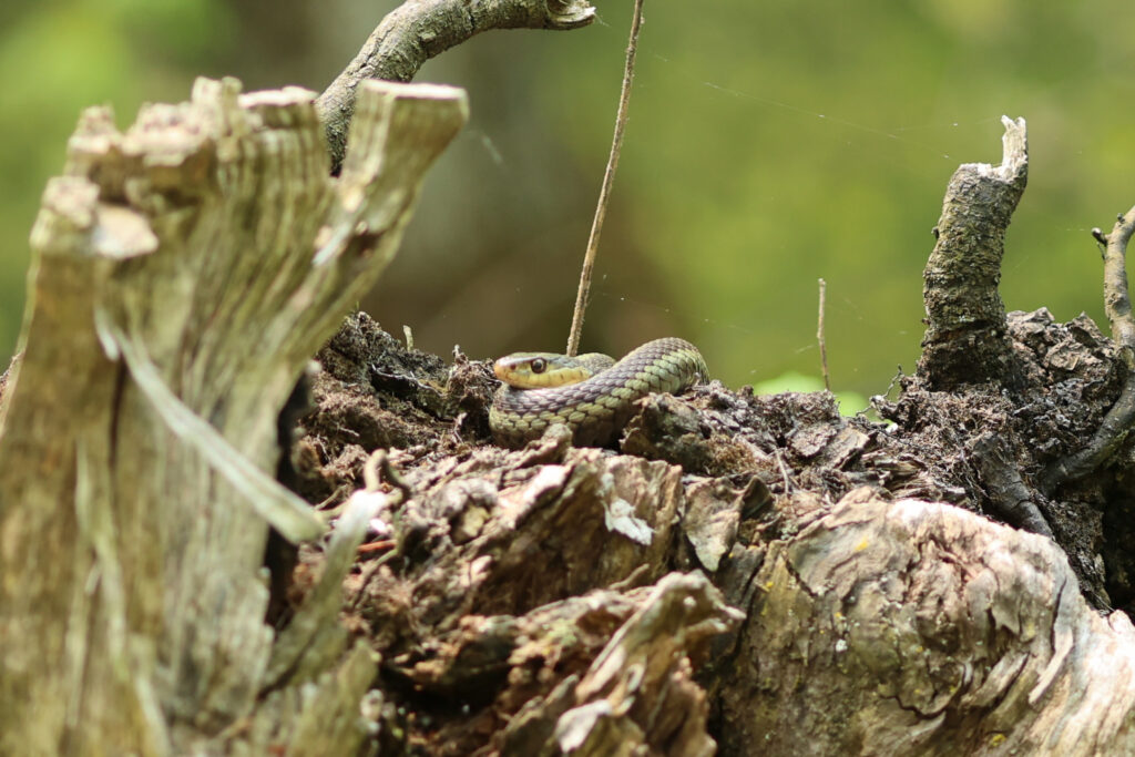 Another photographer told us about a stump near a boardwalk that had a snake resting on the top. We had hoped it was a Eastern Ribbon Snake that is know to be in the area. We thought the skink beside the snake was a small snake at first; that is, until it moved and we saw it had feet!