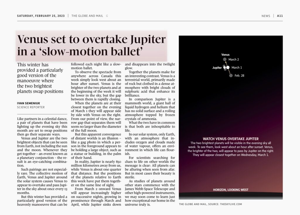 Our weather has continued to alternate between spring-like temperatures and snow accompanied by freezing rain. When the skies have cleared, we have been able to follow the close approach and then the conjunction of Venus and Jupiter in the early evening sky, as described by the science reporter in the Globe and Mail. On February 23rd, we caught the alignment of Venus, Jupiter and the Moon.