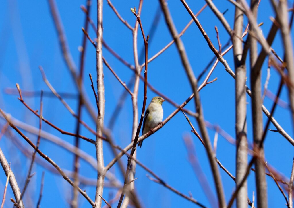 We heard a small flock American Goldfinches before we saw them high up in the bare branches of trees, foraging briefly before flying to a new tree or branch. The males were still pale, in non-breeding plumage, without their distinctive black caps and wings and bright yellow bodies. The females were still dull and brownish.
