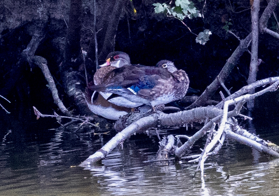 There were Mallards dabbling in the pond. On the far side of the pond, we spotted an immature Wood Duck and two adults in eclipse plumage perched in the shade.