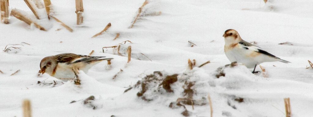 The other birds we often see in winter, especially along rural roads in southwestern Ontario, are Snow Buntings. These birds breed in the arctic tundra, but spend the winter farther south where they can forage in open fields, croplands with grain stubble, shorelines, and roadsides.