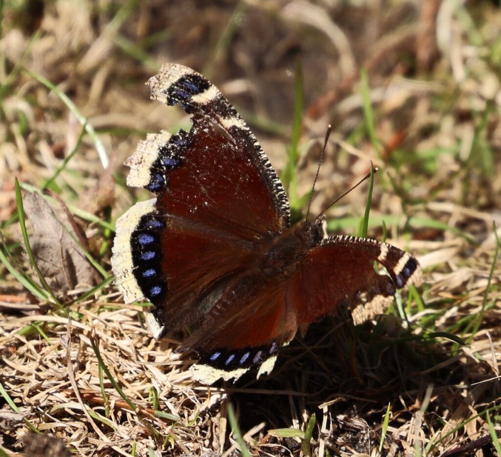 We saw our first butterflies of the year. These are examples of species that overwinter as adults. Although they look rather ragged, they might live another month, long enough to breed! I got feedback that the one on the right may have emerged months earlier than usual, perhaps due to the heat.