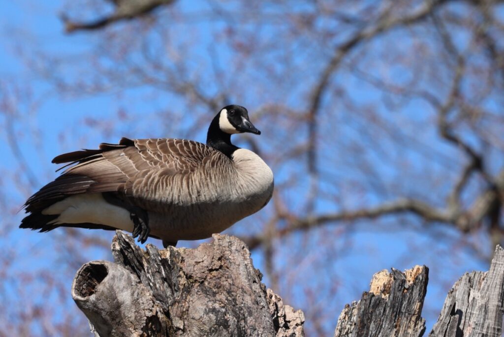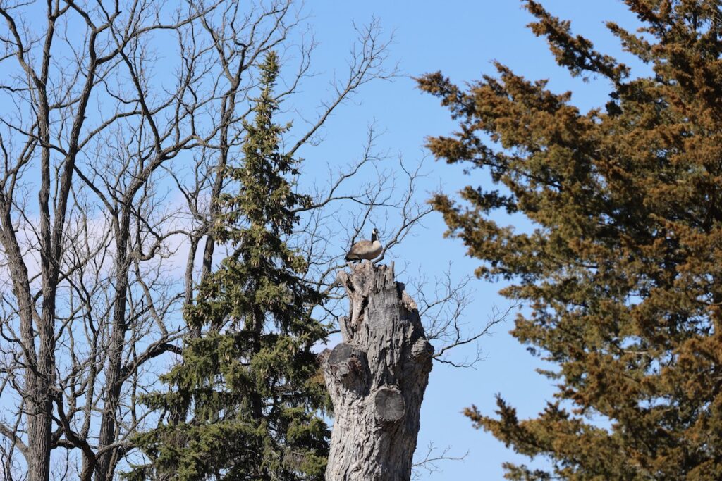 There were several American Robins and Canada Geese. The geese made themselves known with their honks and by sometimes squatting close to the road. One chose an interesting perch. It might work as a safer location for a nest than the ground.