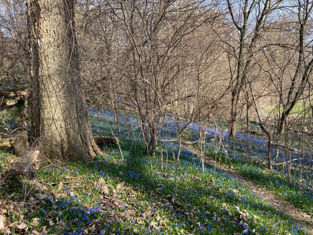 The heat has forced some early spring blooms. There are great sweeps of bluebells carpeting hillsides and lawns and patches of violets in bloom.